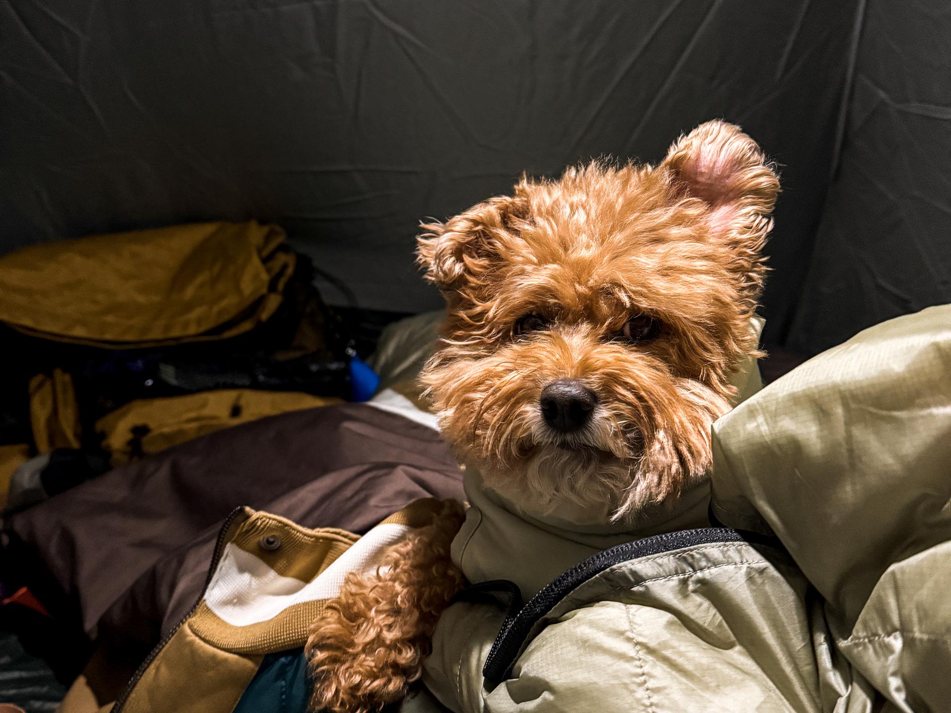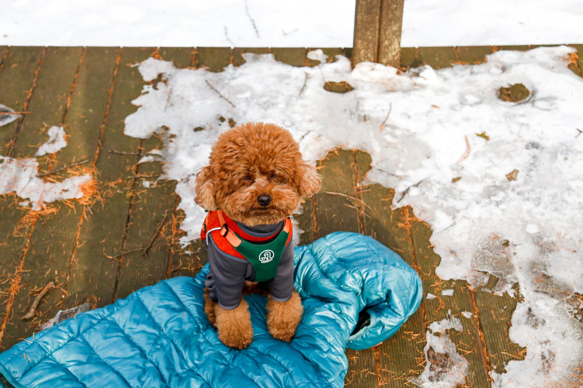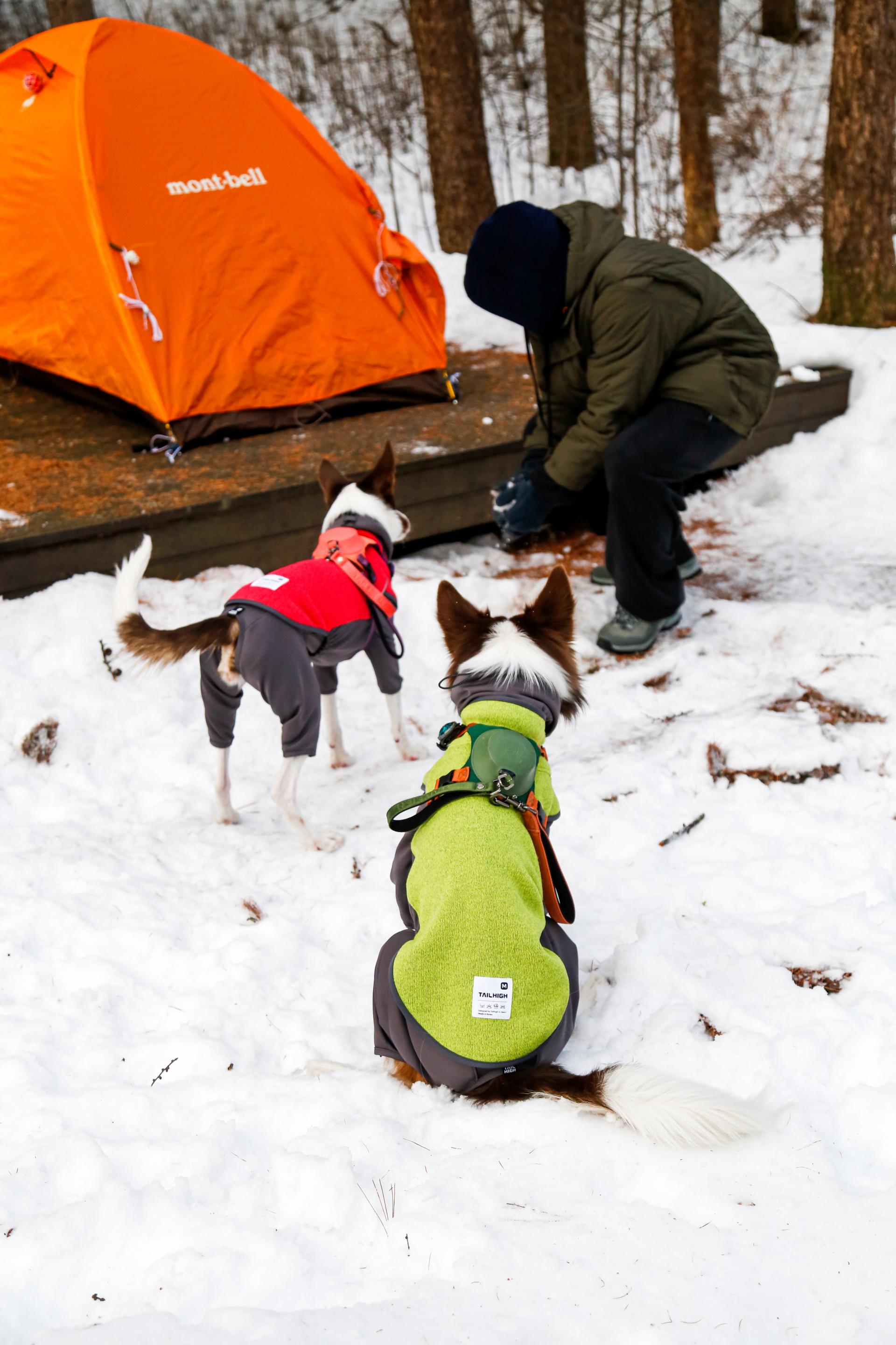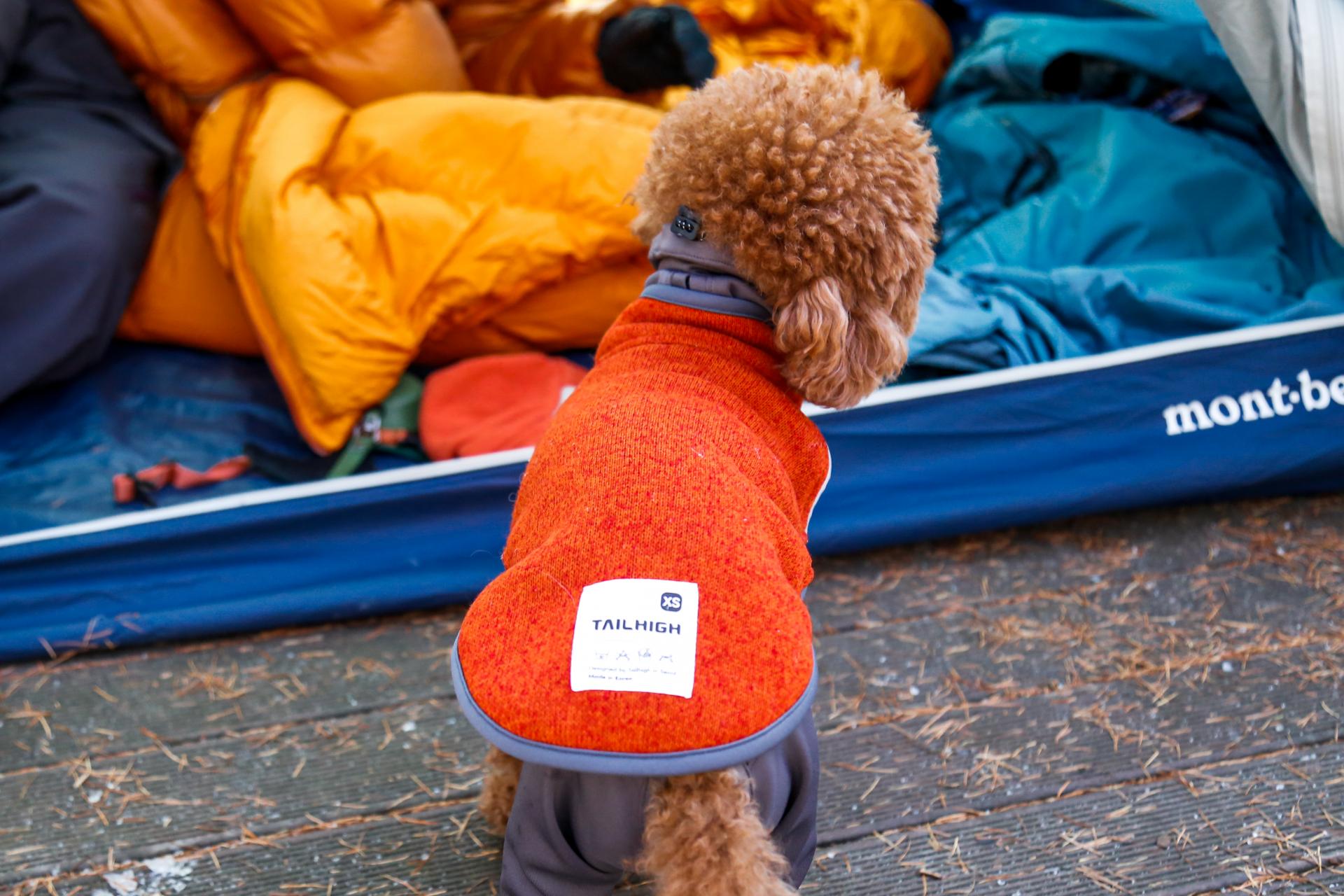 다른 친구들보다 조금 더 통통한 별이는 플리스히터탑과 올웨더 패딩, 두 개의 옷을 입는 것만으로 충분했습니다. 텐트 안이 차가운 공기로 가득 채워져도 침낭 안으로 들어오는 것을 거부하던 강아지는 입고 있는 옷의 온기만으로 그 밤을 지냈습니다.