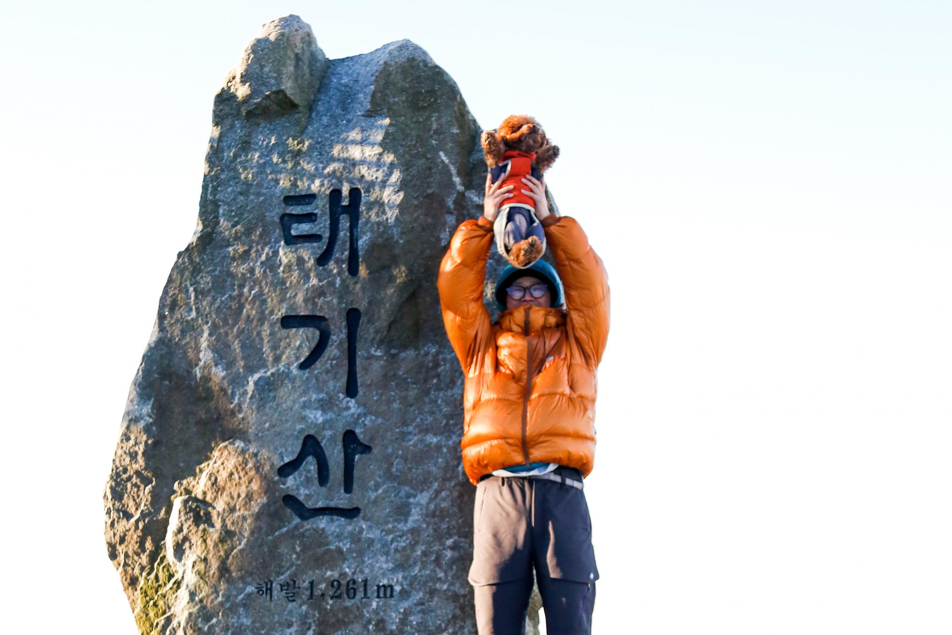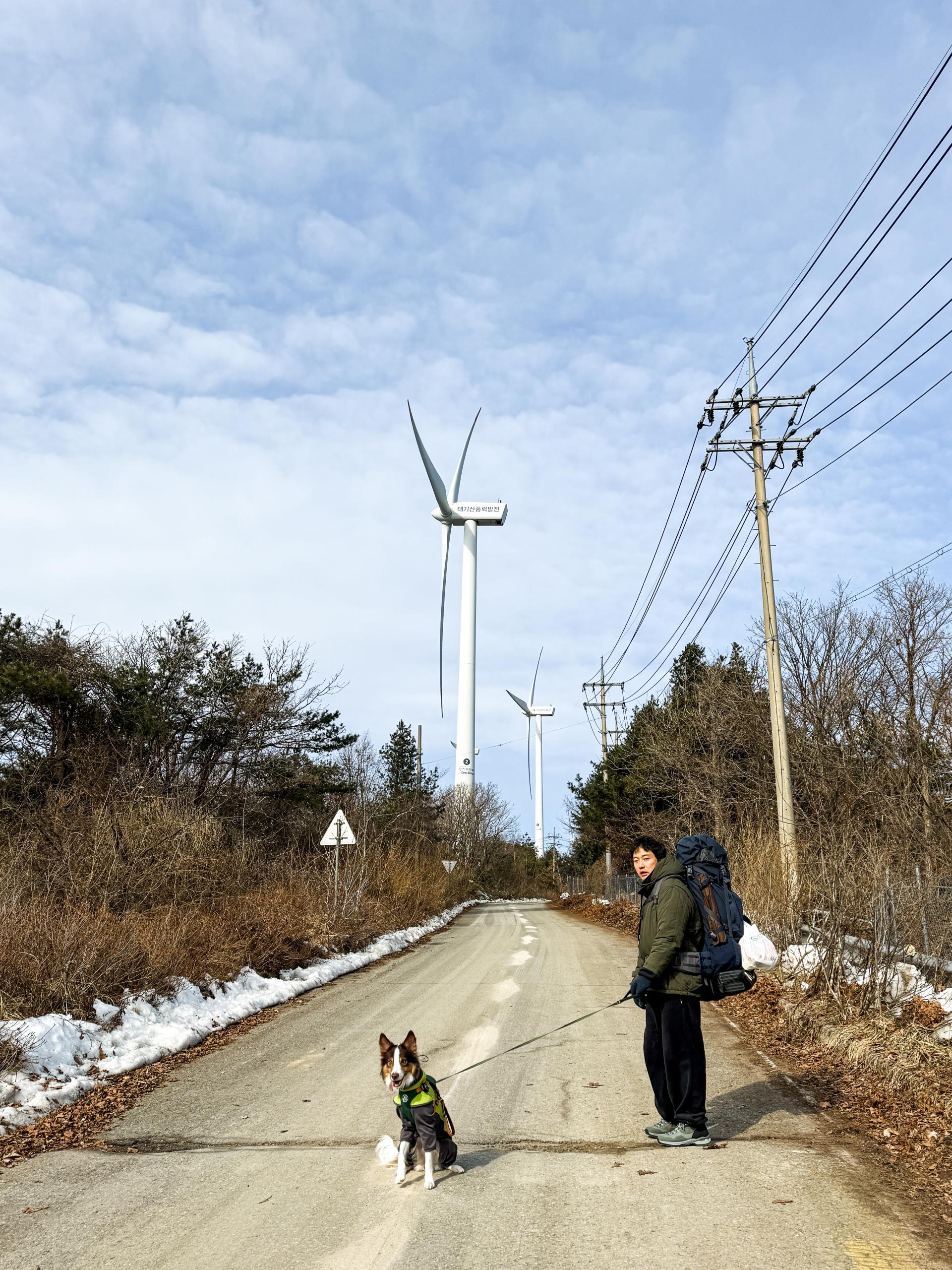 끝이 없을 것처럼 펼쳐져 있던 길이건만, 지치지 말라는 듯 정상석이 눈 앞에 나타났습니다. 해발 1,261M 높이에서 보이는 눈이 덮힌 강원도의 산들과 풍력발전기는 정말 장관이었습니다. 이 순간에 강아지들과 함께 하고 있다는 것이 그 무엇보다 더 특별했습니다. 태기산에 와서, 정상까지 올라와서, 덕분에 느낄 수 있는 감정이었습니다.
