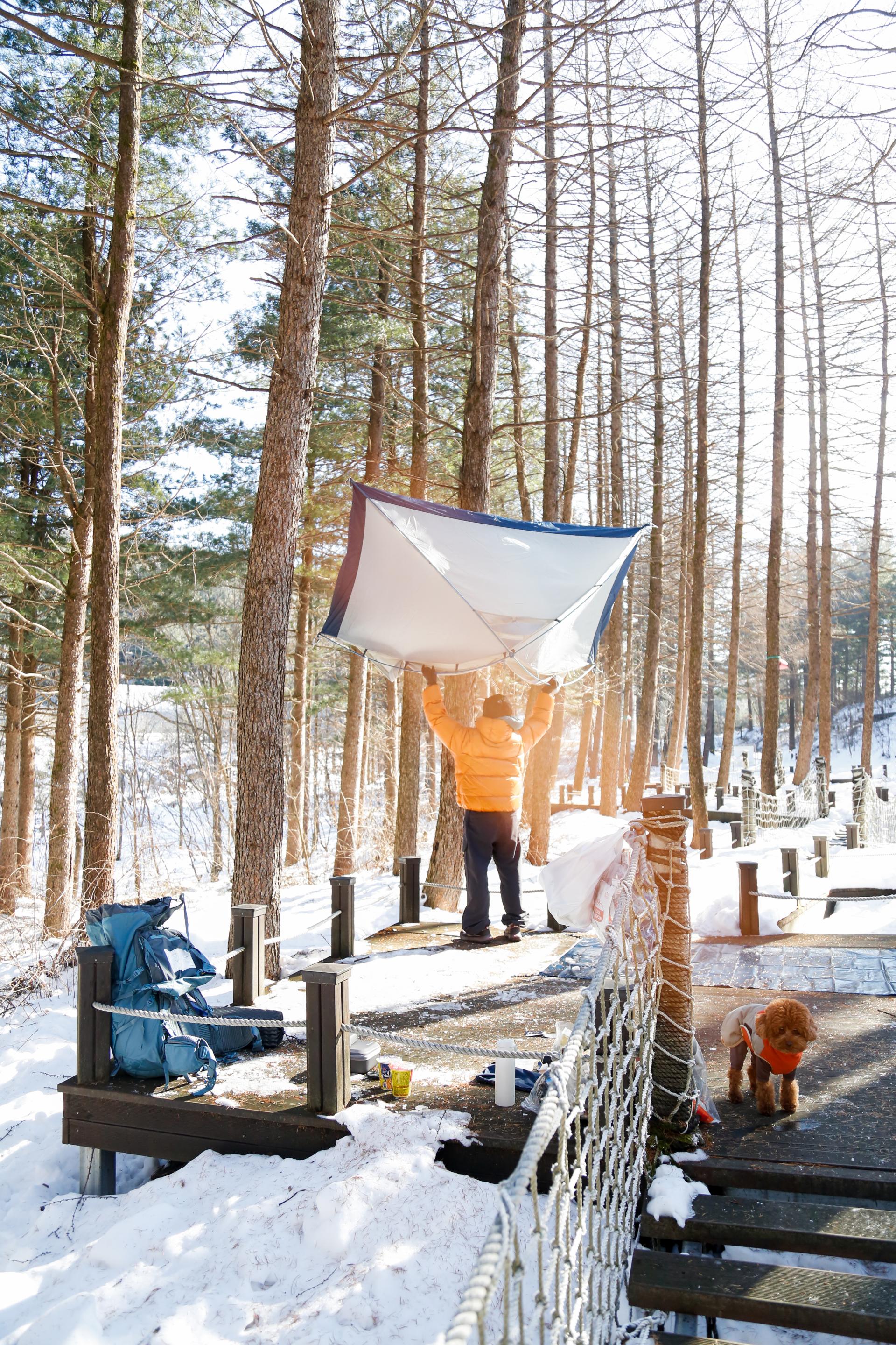 금요일 오후 일찍 도착해서인지 백패킹 성지로 불리는 태기분교에 우리팀 외에는 아직 그 어떤 텐트도 보이지 않았습니다. 덕분에 우리는 원하는 맘에 드는 장소를 고를 수 있었고 숲과 가장 가까운 데크를 골라 각자의 텐트를 피칭하기 시작하였습니다.