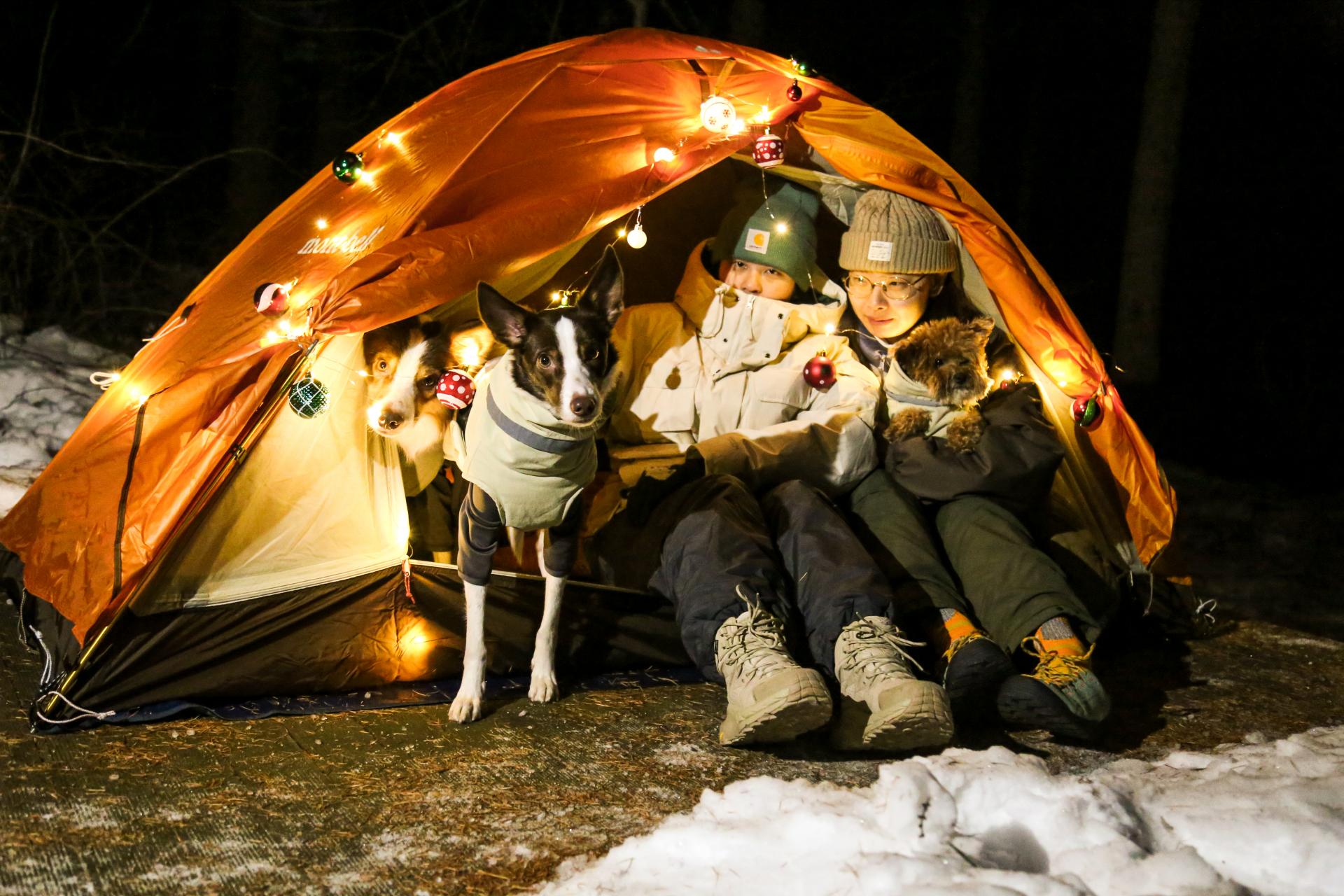 미리 메리크리스마스! 우리는 조금 이르지만 특별한 화이트 크리스마스를 맞이했습니다. 텐트에 작은 LED 전구를 걸고, 크리스마스 장식으로 꾸몄습니다. 강아지들을 호기심 가득한 눈빛으로 바라보며, 이 특별한 공간이 마음에 드는 듯 연신 꼬리를 흔들었습니다.