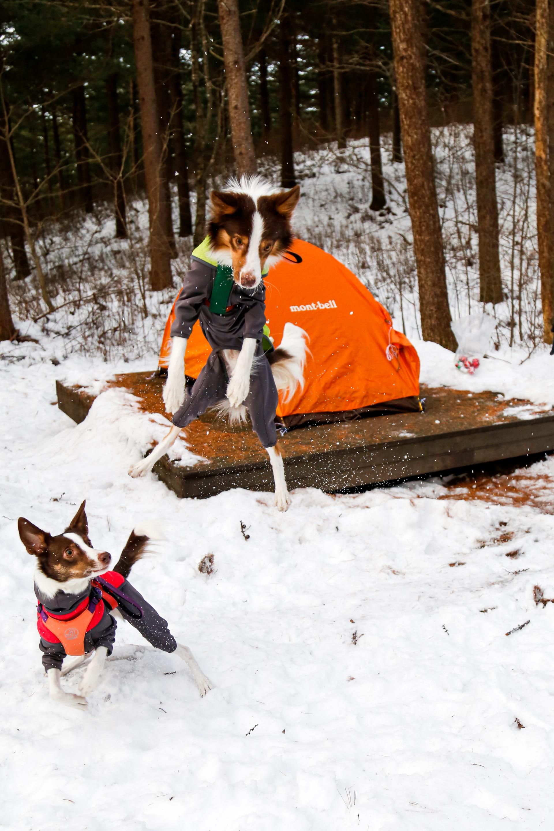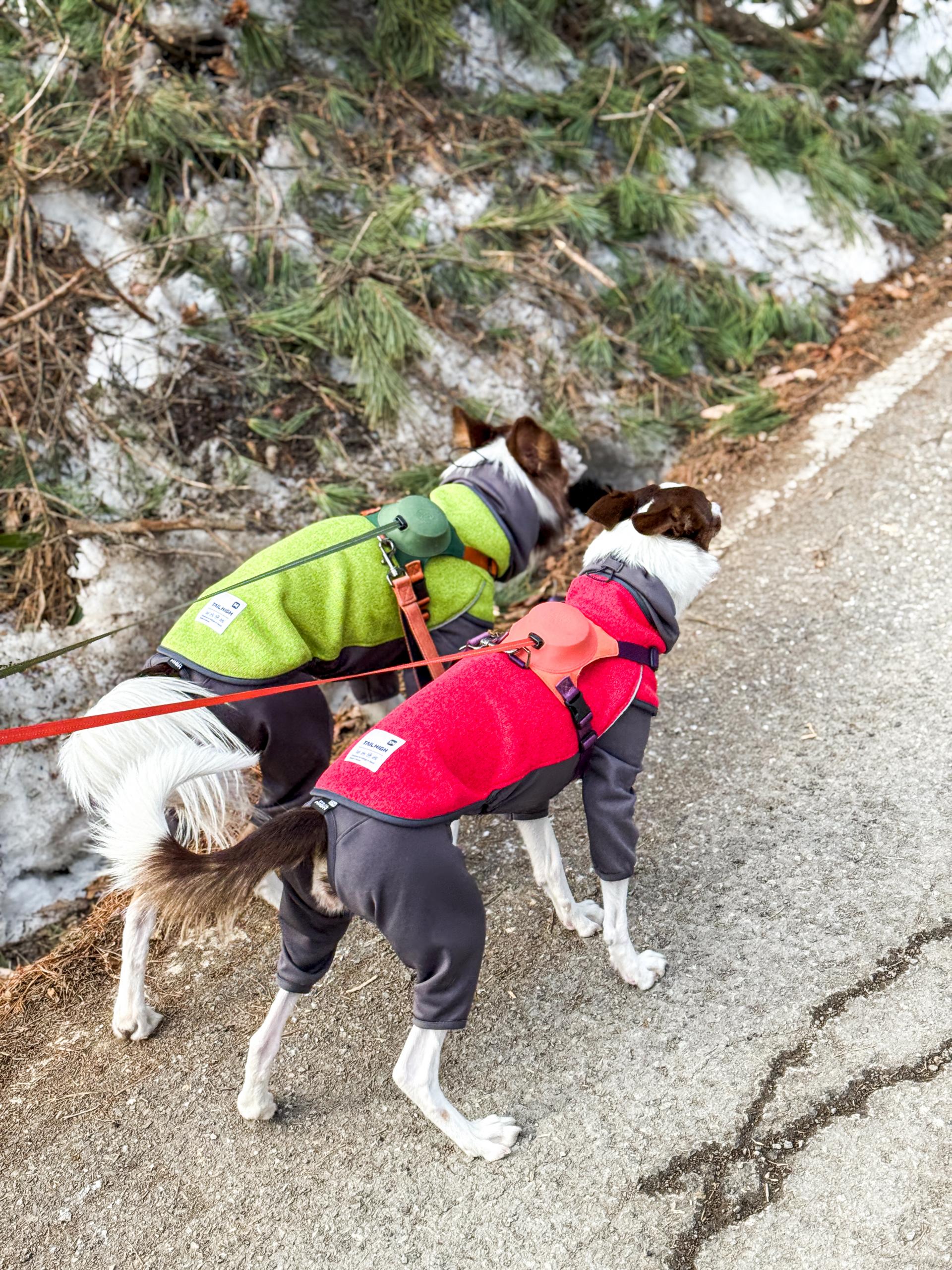 텐트를 설치한 우리는 그 뒷쪽, 아무도 없는 눈 쌓인 숲속으로 걸어갔습니다. 그 곳은 눈에 덮힌 나무들이 가득했습니다. 강아지들이 그 곳에 발을 디딘 순간, 강아지들이 입고 있던 새로운 컬러의 플리스 히터탑이 시야를 꽉 채웠습니다. 내 강아지의 움직임을 놓치지 않도록, '스트로베리 핑크' 와 '라임 그린' 그리고 '메이플 오렌지' 세 가지 컬러가 하얀 눈에 페인트를 칠한 듯 아름답게 돋보였습니다. 강아지가 어디에 있든 한 눈에 알아볼 수 있도록 픽한 우리의 의도가 정확했습니다.