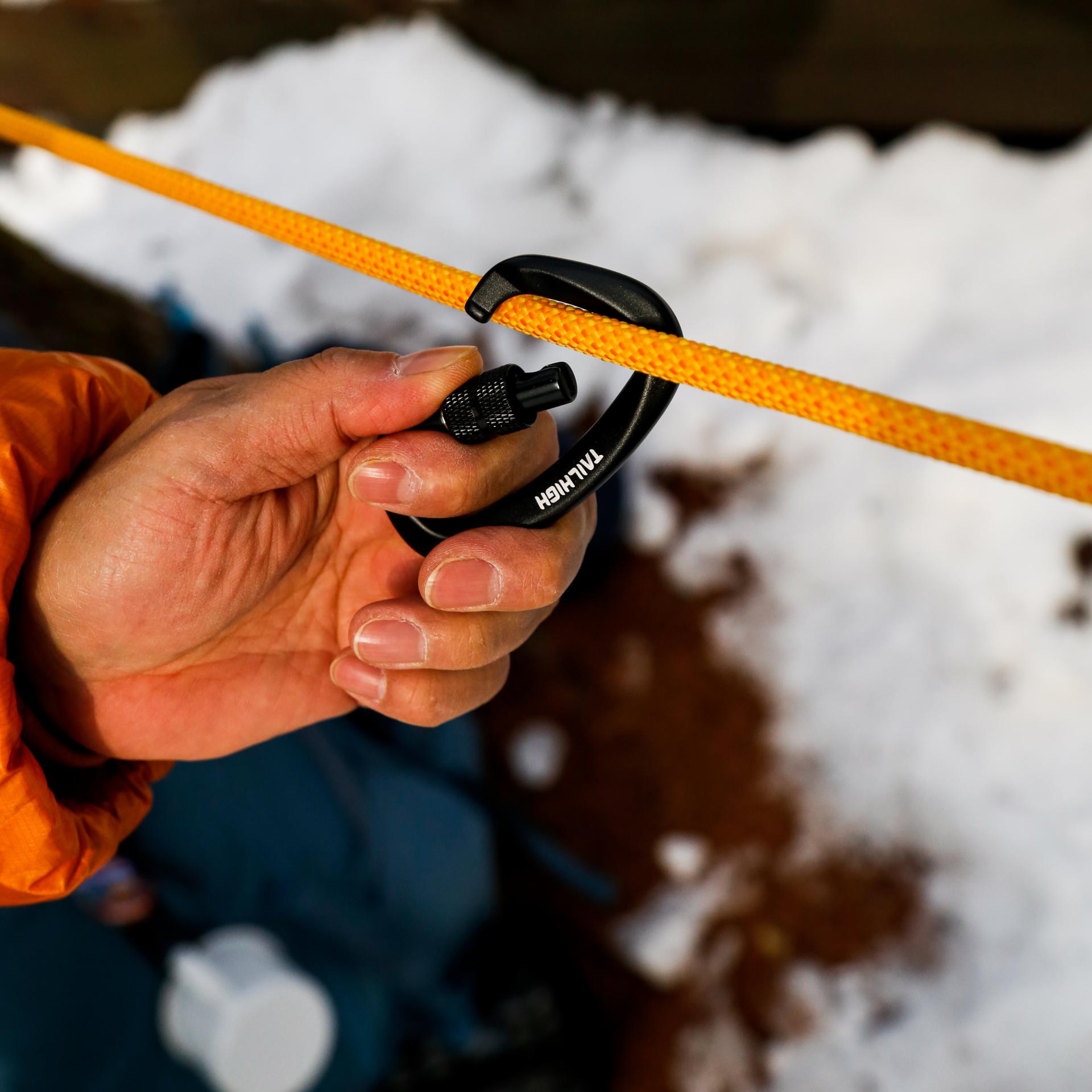 미리 준비한 테일하이 로프 8m (좌) 와 테일하이 로프 전용 고정 악세사리를 사용하여 나무에 로프를 고정하는 모습(우)