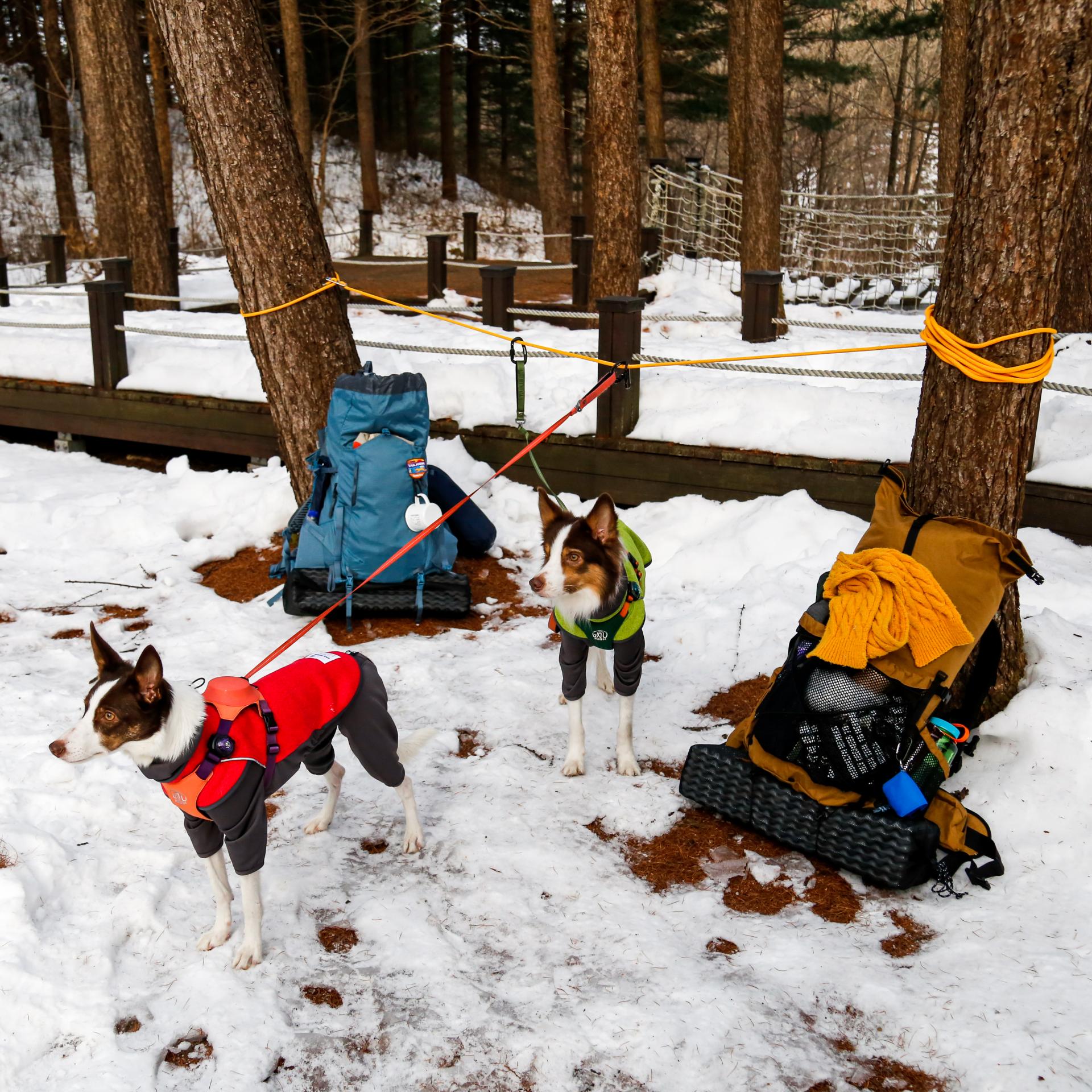우리가 태기분교에 도착해서 텐트를 치는 동안, 우리는 강아지들을 가볍고 탄성있는 테일하이 로프와 고정용 악세사리를 활용하여 나무와 나무 사이를 연결한 로프 도그 파킹(Rope Dog Parking)을 만들고 그 곳에 손잡이를 고정하여 두었습니다. 아이들은 우리가 하루를 지내기 위한 보금자리를 만드는 동안 그 곳에서 안전하게 머물렀습니다. 텐트를 치는 우리를 바라보기도 하고, 엎드려서 체력을 충전하고, 또 때로는 서로에게 장난을 치면서 그렇게 그 장소에서 오늘 하루를 머물 집이 완성되기를 기다렸습니다.