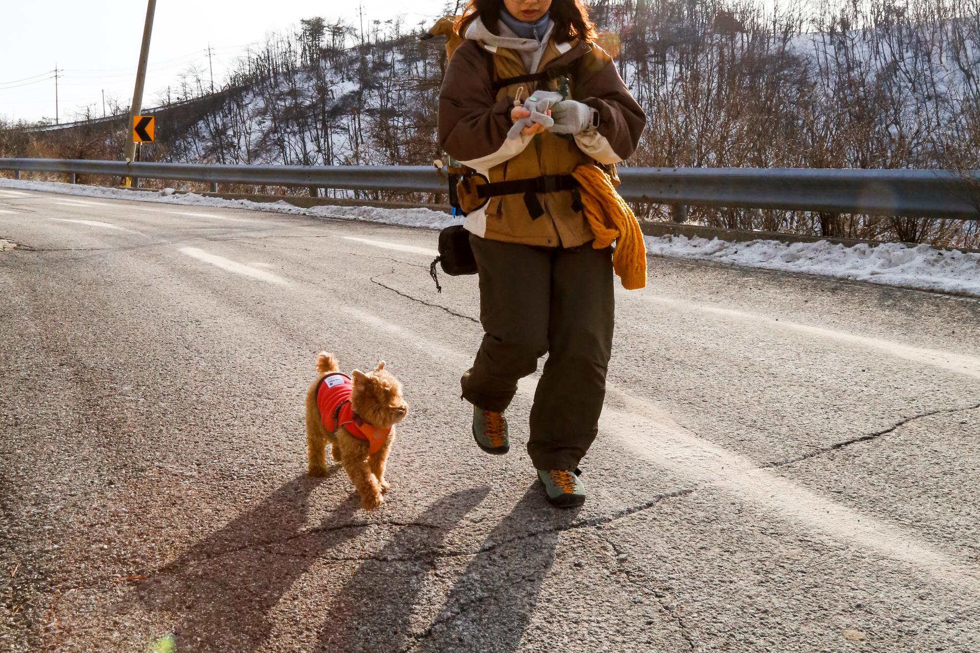 토요일 이른 아침, 우리는 태기분교에서 정상석까지 새로운 도전을 시작했습니다. 강아지들은 쌀쌀한 아침 날씨에 오늘도 히터올인원, 플리스히터탑, 올웨더패딩을 입었습니다. 오르막과 내리막이 반복되는 코스였지만, 강아지들은 지치지 않고 우리와 나란히 걸었습니다. 바람에 돌아가는 풍력발전기의 그림자가 우리를 계속해서 덮쳤습니다.