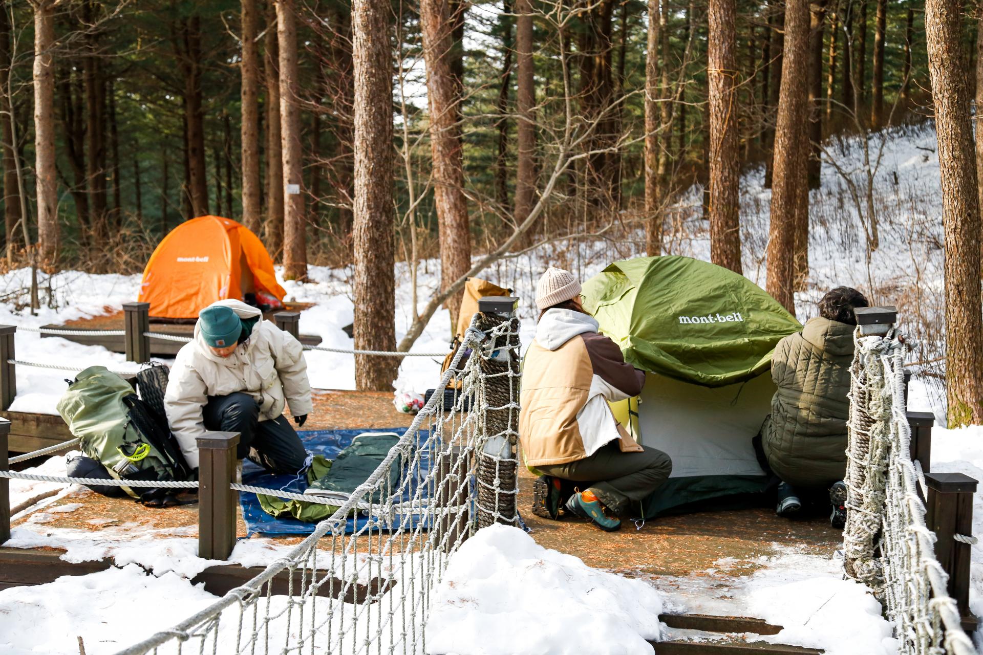 숲과 가장 가까운 데크에 각자의 텐트를 피칭중인 테일하이 멤버들