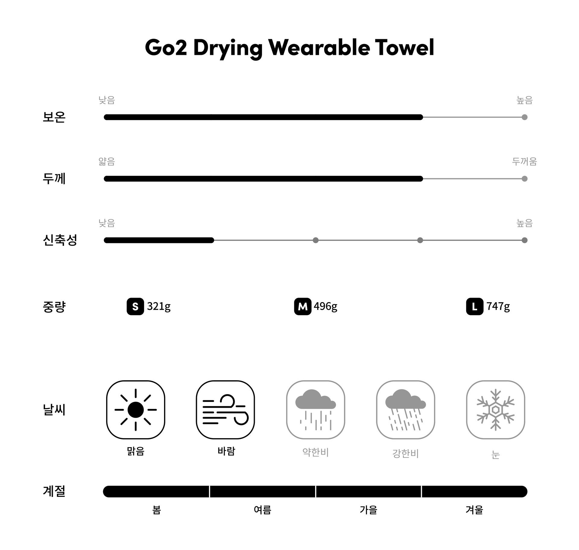 목욕 및 물놀이 후 15~ 20분 정도 젖은 상태에서 입혀두면 80% 이상의 물기가 빠르게 건조됩니다. 이후 가벼운 드라이 또는 빗질로 털을 정리해 주면 보다 쉽게 말려줄 수 있습니다.