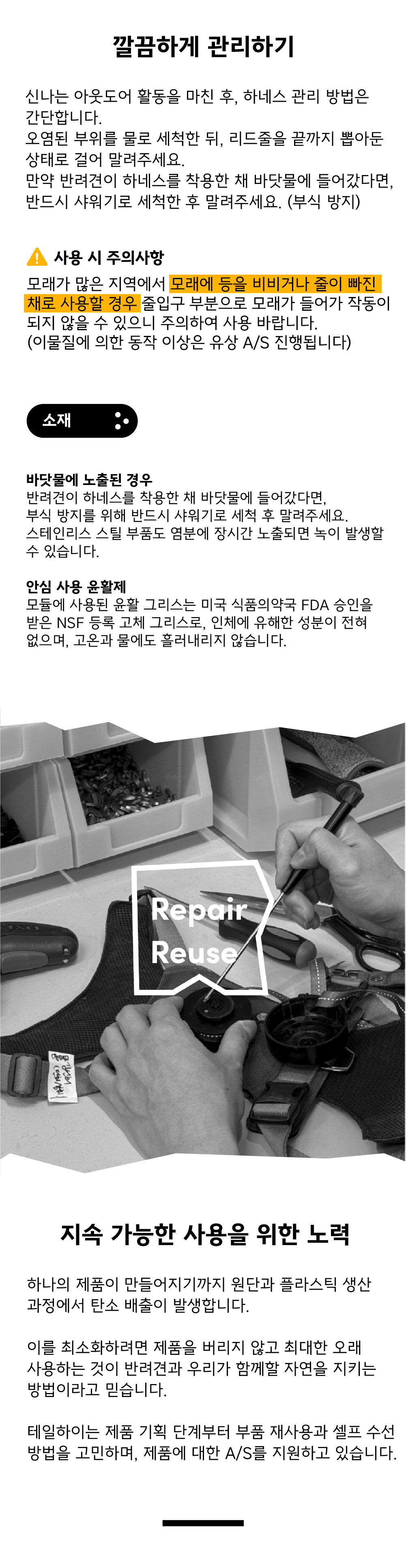 * 소비자 부주의에 의한 제품 훼손 및 제품의 변형, 품질 보증기간이 경과한 제품에 대해서는 보상의 책임을 지지 않으며, 수선 및 수리 가능한 경우에 한하여 유상으로 수선이 가능합니다. 테일하이에서는 자가 수선이 가능한 스페어 파츠를 판매하고 있습니다. 자가수선이 가능한 경우 자가수선을 권장드릴 수 있습니다.